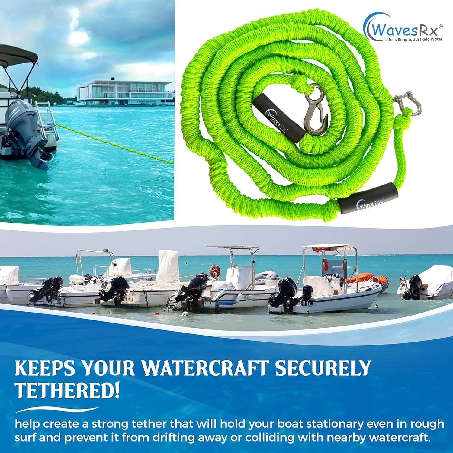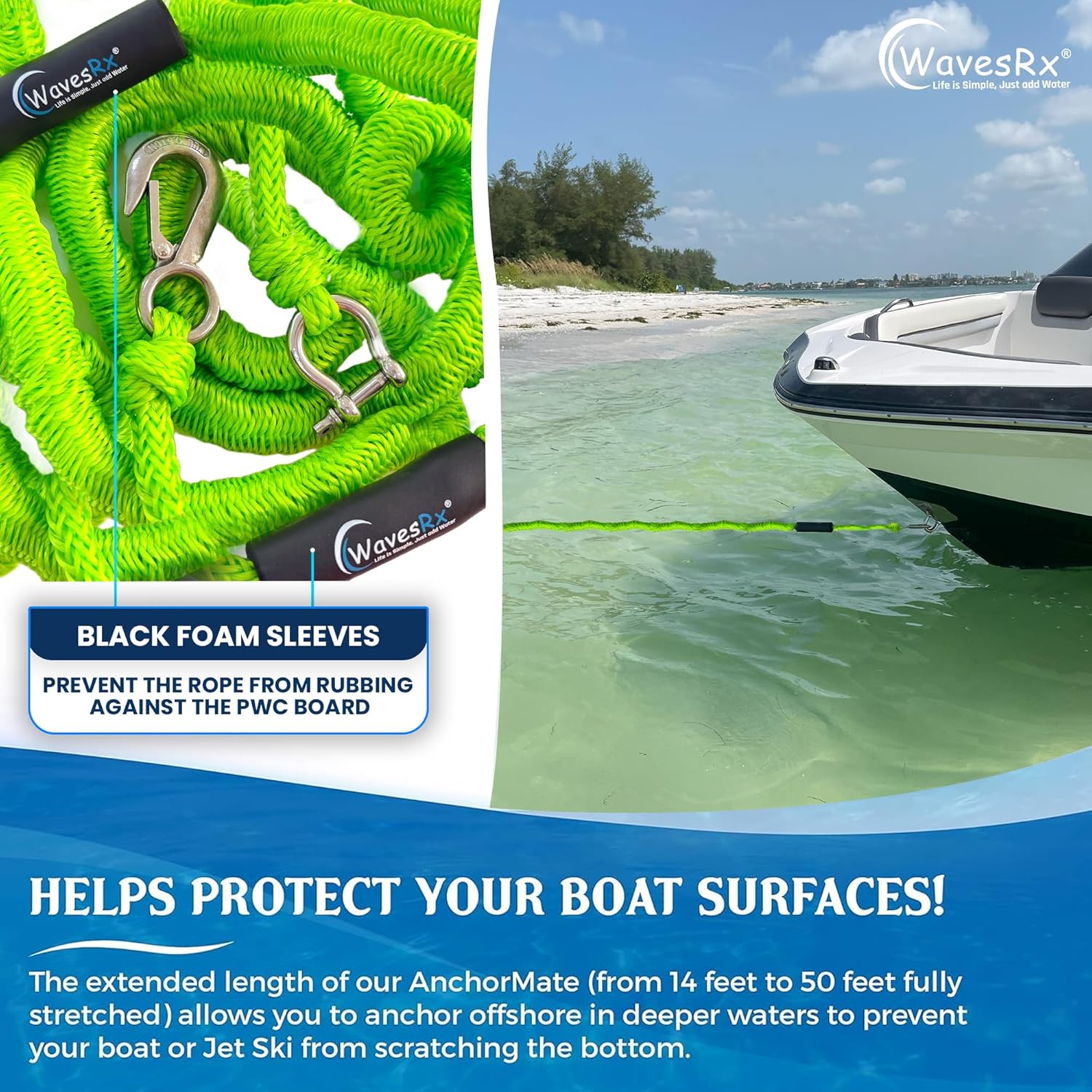 - HELPS PROTECT YOUR BOAT! - The extended length of our AnchorMate (from 14 feet to 50 feet fully stretched) allows you to anchor offshore in deeper waters to prevent your boat from scratching the bottom. The foam sleeves help prevent the rope from rubbing against the PWC surfaces. It comes in a ventilated heavy duty Storage Bag, to easily stow away when not in use and a Convenient Snap Hook for effortless attachment to Bow or Stern Eyes.