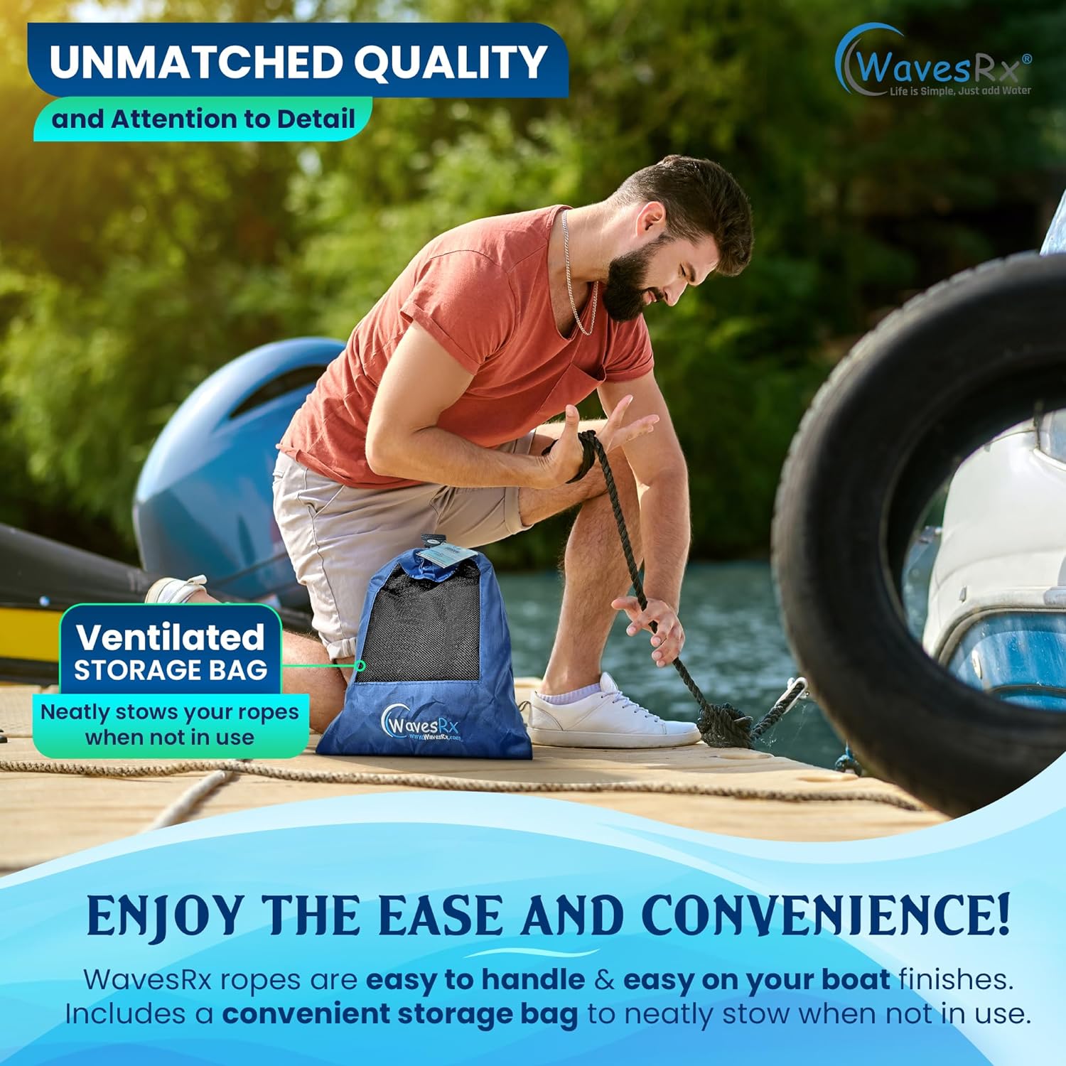 - EXPERIENCE THE WAVESRX DIFFERENCE! - we pay extra attention to the little things that turn a good product into an Exceptional one! Our Dock Line comes with a large 15” spliced end loop so you can easily attach it to a dock or your boat’s cleat. The rope ends and splice points are heat treated and double reinforced to prevent fraying and significantly extended lifespan.