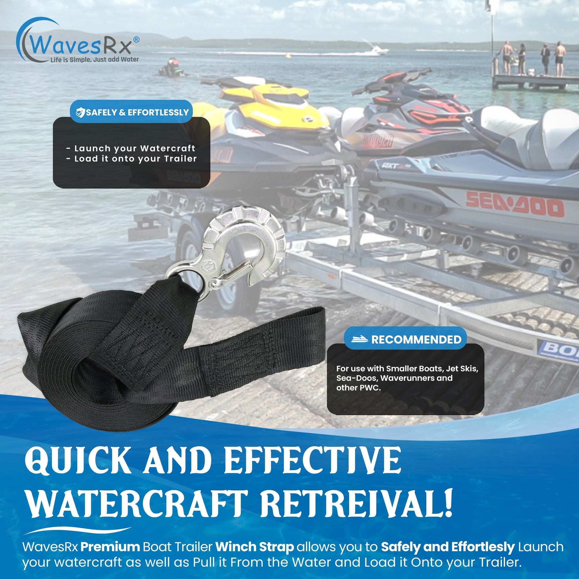 - QUICK AND EFFECTIVE WATERCRAFT RETREIVAL! WavesRx Premium Jet Ski Trailer Winch Strap allows you to Safely and Effortlessly Launch your watercraft as well as Pull it From the Water and Load it Onto your Trailer. Recommended for use with Smaller Boats, Jet Skis, Sea Doos, Wave Runners and other PWC.